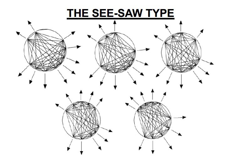 The See-saw type is sensitive to both sides of any situation. You will be continuously challenged to empower one side or the other. As soon as one side predominates, the other will make demands. You live in a world of polarities and conflicts. You are capa­ble of a vast understanding but too often waste your energies by being incorrectly aligned.